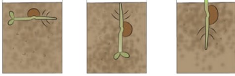 The experiment shown in the picture (with seeds placed in soil in different positions) is designed by Tara and Vijay is to find out the direction of growth of roots and shoots in a germinating seed ( Geotropism or response to gravity. After a few days of setup ,the root will always bend and grow downward (toward gravity) and the shoot will always bend and grow upward (away from gravity). This will happen even if the seed is placed horizontally, upside down, or sideways.